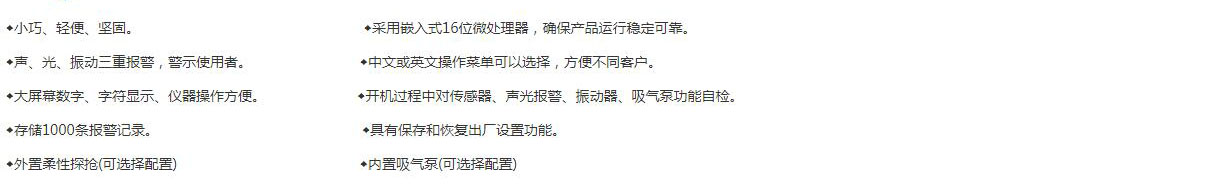 儀器內(nèi)部采用大容量鎳氫可充電池,待機(jī)時(shí)間長;數(shù)字LCD液晶字符顯示,清晰直觀、儀器操作方便;具有二級聲、光、振動(dòng)三重報(bào)警功能,對預(yù)設(shè)報(bào)警濃度能夠及時(shí)、準(zhǔn)確、直觀的報(bào)警提示警示;儀器本機(jī)可以存儲1000組報(bào)警記錄,每組報(bào)警信息包括本組報(bào)警記錄的首報(bào)值、極大值和報(bào)警時(shí)間等信息。儀器外觀采用特殊高強(qiáng)度ABS工程塑料,時(shí)尚外形設(shè)計(jì),美觀、手感好、耐用。產(chǎn)品具有反應(yīng)速度快,穩(wěn)定性好、靈敏度高、體積小、重量輕、攜帶方便等優(yōu)點(diǎn)。